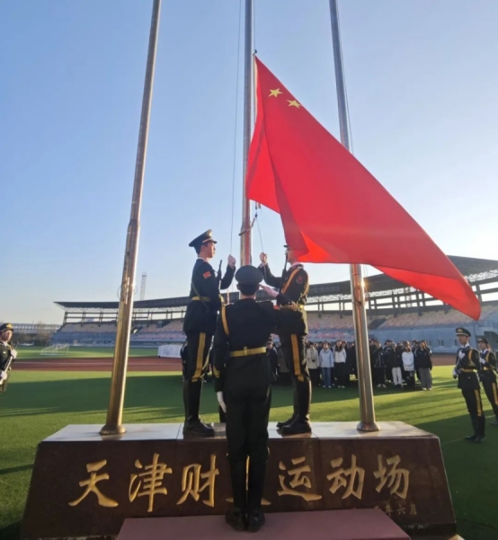 天财国旗护卫队迈着沉稳且坚定有力的步伐,护送着国旗庄重入场。伴随着激昂雄壮的国歌声,鲜艳的五星红旗在微风轻拂下顺着旗杆缓缓升起。全场师生整齐肃立,目光紧紧追随着国旗,行着注目礼。在这一时刻,每个人心中涌动的不只是对往昔峥嵘岁月的深情回望,更是一次爱国主义精神的深刻洗礼与传承。