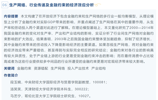 国际经济贸易系本科生汤笑笑同学的合作论文《生产网络、行业传递及金融约束的经济效应分析》在《财贸经济》2023年第6期发表。《财贸经济》是综合财经领域各个学科、国内外公开发行的学术期刊,不仅在南京大学中国社会科学研究评价中心“中文社会科学引文索引(CSSCI)来源期刊”中名列前茅,而且在国内经济理论文献及主要文摘类报刊的转载率也不断上升。