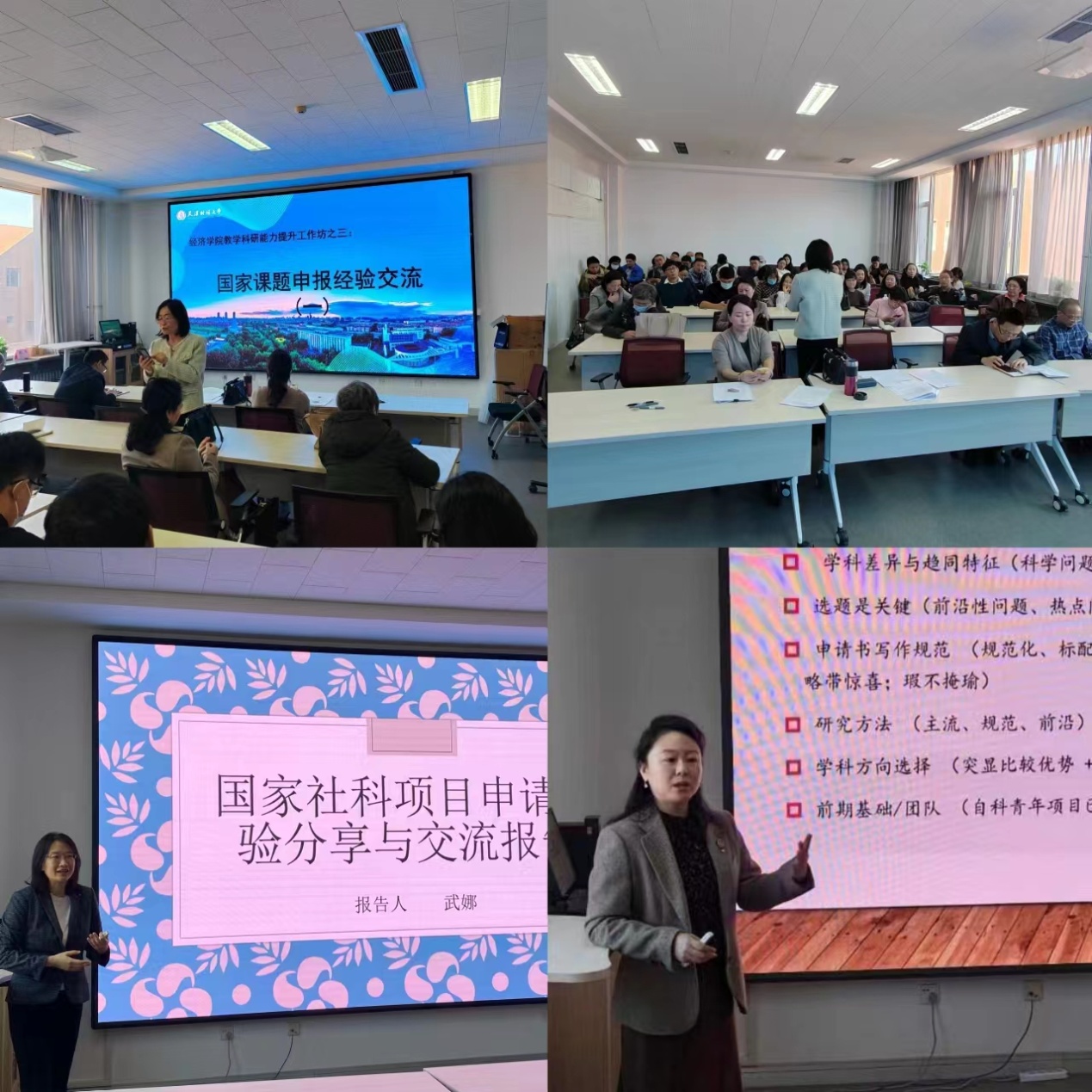 2023年度国家社科基金与省部级项目的申报及立项情况,并做了2024年度国家课题的申报动员。她强调了国家课题申报的重要意义,鼓励学院教师继续保持科研冲劲,争取再创佳绩。随后,刘娟教授从经济学和管理学学科差异、不同学科下选题异同点、申请书写作范式等相关问题,结合自身在国家自科青年项目和国家社科一般项目申报工作中的经验和体会,与学院中青年教师进行广泛的交流分享;并就当前经管类专业国家课题申报的前沿性问题、热点问题及申报人关心的相关问题与学院教师进行互动。武娜教授从选题、选题背景与意义、文献综述、学术价值与应用价值、研究内容、创新之处等方面分享交流了撰写申请书的经验与体会。