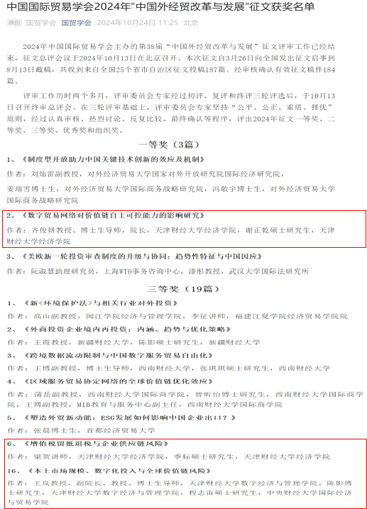 2024年11月22-23日,中国国际贸易学会年会暨国际贸易发展论坛在对外经济贸易大学隆重举行。本届年会以“建设更高水平开放型经济新体制”为主题,并进行了2024年中国国际贸易学会“中国外经贸发展与改革”征文的颁奖仪式。本年度征文活动共收到来自全国各省、自治区、直辖市征文投稿184篇,共评出论文一等奖3篇,二等奖6篇,三等奖19篇。我校耽美漫画