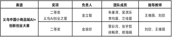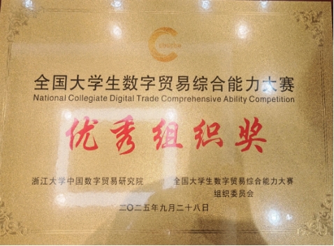 全国大学生数字贸易综合能力大赛由浙江大学中国数字贸易研究院主办,已连续成功举办四届,累计吸引1213所高校、60000余名师生参与。本届大赛的“义乌中国小商品城AI+创新创业”赛道深度联合义乌中国小商品城大数据公司,基于义乌小商品市场的商贸资源和Chinagoods平台的数字贸易基础设施,鼓励大学生与市场企业深度链接。赛事自2025年1月启动以来,吸引了全国309所高校的2279支团队、10229名学生参赛。其中,我校由金立智等五名同学组成的“第五象限突击”队荣获该赛道二等奖及义乌AI创业之星奖;金瑜珍等五名同学组成的“贸e先锋”队同样荣获赛道二等奖。