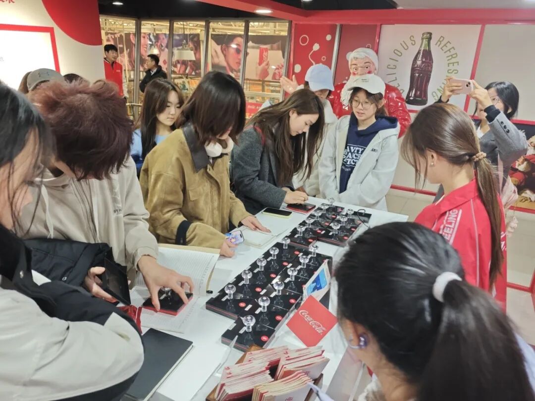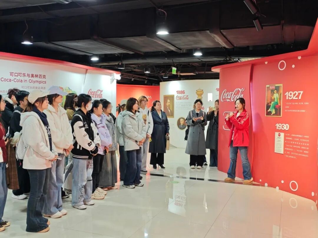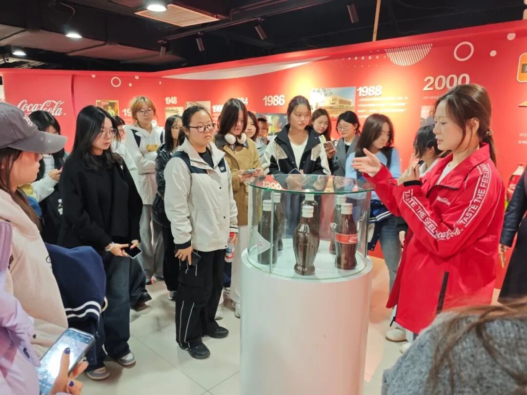 随后,师生一行在讲解员的带领下参观了可口可乐博物馆。讲解员详细介绍了可口可乐的百年品牌历史、公益品牌形象、耽美漫画以及先进的生产工艺。师生们近距离感受历史商标、经典广告标语中的品牌魅力,了解旗下全品类产品,深度体验了可口可乐的品牌文化。