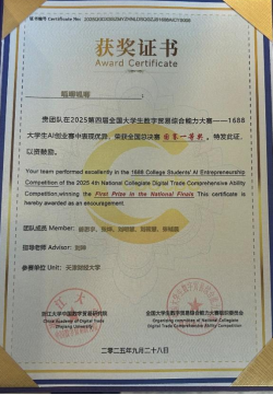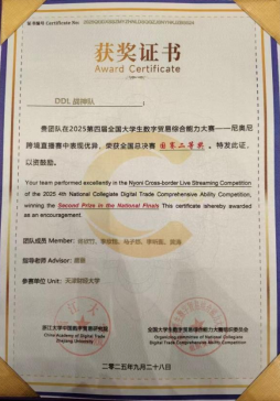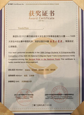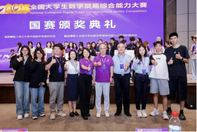 全国大学生数字贸易综合能力大赛由浙江大学中国数字贸易研究院主办,已连续成功举办四届,累计吸引1213所高校、60000余名师生参与。本届大赛中1688大学生AI创业赛道共有240所院校的1198支团队参赛,姜思宇5名同学组成的“呱唧呱唧”队获该赛道一等奖1688数创铜星;由周婧怡5名同学组成的TradeFlux获该赛道等奖。尼奥尼跨境直播赛道共有177所院校的661支团队参赛,佟欣竹5名同学组成的DDL战神获该赛道二等奖。经济学院教师刘珅获优秀指导师奖。
