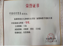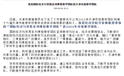 积极参与申报“数字+” 校级重点建设课程6项,并以数字技术和实体经济深度融合为发展方向,升级迭代传统课程,努力建设数字化、智能化、网络化的“数字+”课程。同时积极申报天津市重点教改项目《数字经济背景下国际贸易专业数智化教学新模式的探索与实践研究》和一般项目《一流专业建设背景下国际商务人才新技术素养提升研究》,并及时应用于课程和专业建设。截止目前,《国际贸易理论与实务》课程获批国家一流线上课程,《宏观经济学》、《国际贸易与实务》等四门课程获批天津市一流课程和天津市创新创业教育特色示范课程。《中国对外贸易》等十余项课程获批校级重点课程。“国际贸易实务技能拓展实践基地”等多项教学改革和产学研项目获得教育部立项。主持的“服务开放型经济、政产学研互动的国际经贸类研究生人才培养模式探索与实践”获得天津市教学成果二等奖。同时积极组织教师参加教学大赛,王岚、王维薇、刘欣等教师在天津市教学创新大赛中分别获得二等奖和三等奖。注重人才梯队和培养,在已有教育部新世纪优秀人才支持计划、天津市131创新型人才第1、2、3层次和天津市学科领军人才等基础上,杨勃、曹清峰、赵文涛3位青年教师入选耽美漫画